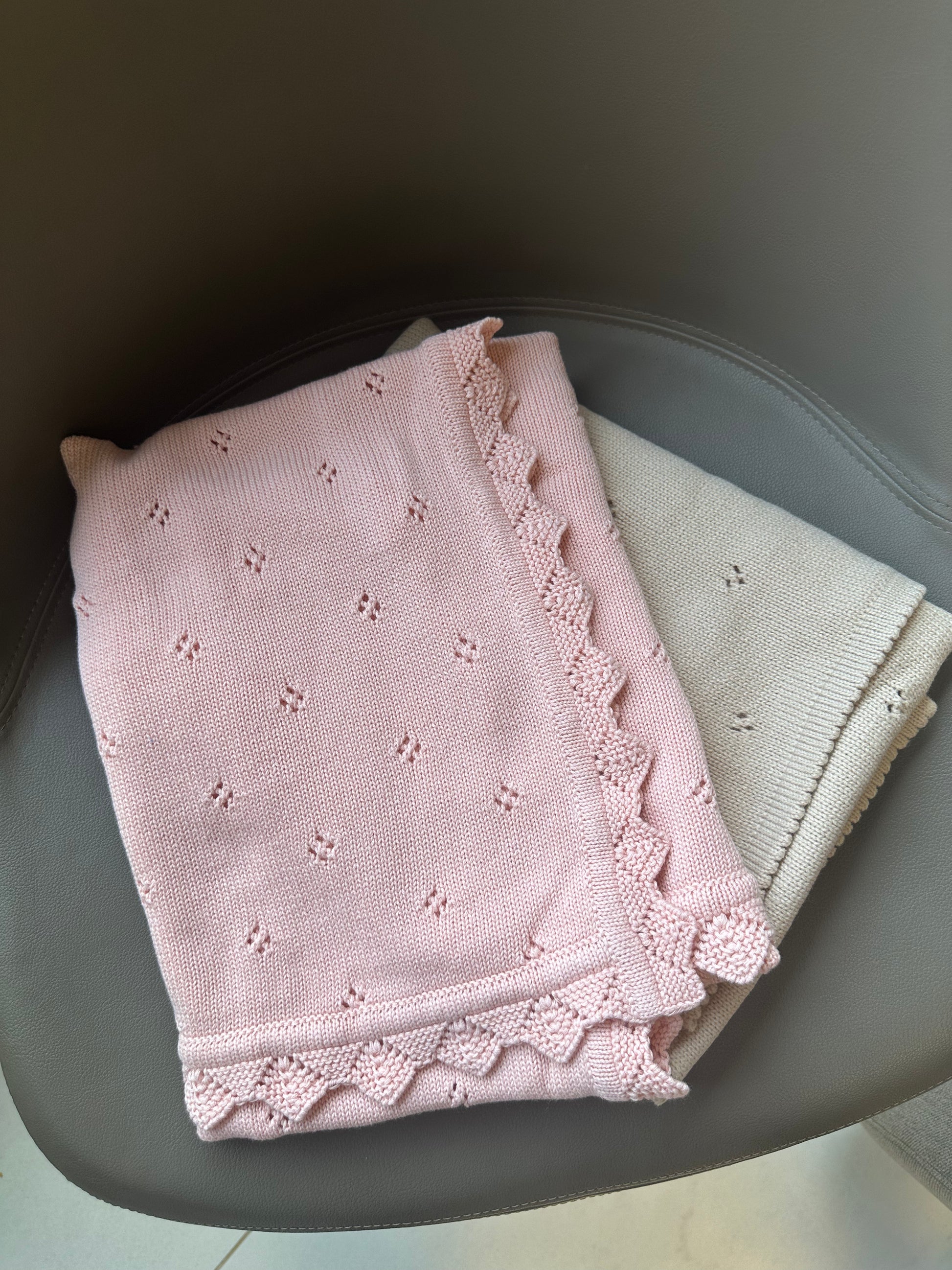 Lace knitted baby swaddle blanket.